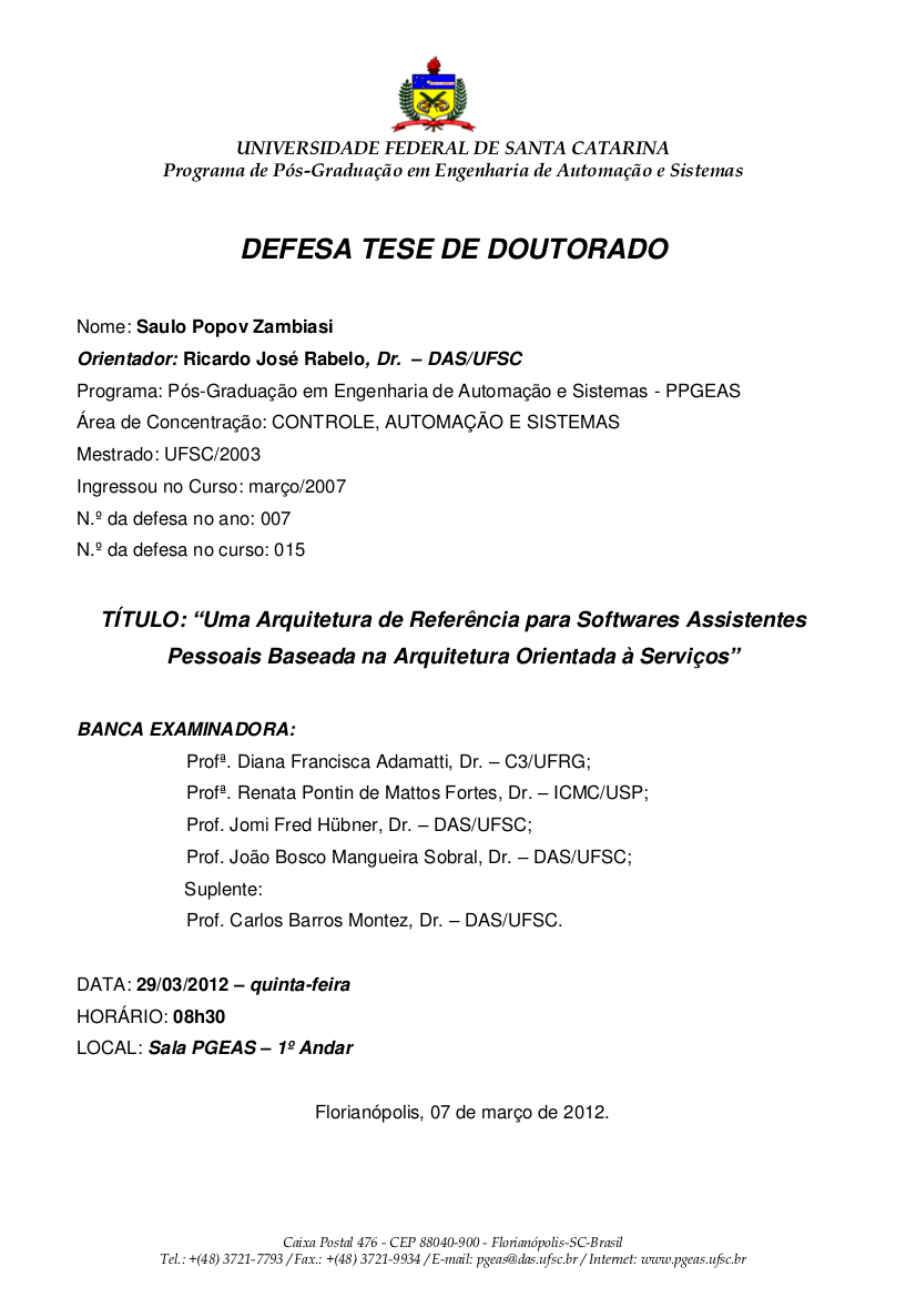 No período de janeiro houve então um descanso, merecido, para que eu pudesse repor as energias para começar um novo ano. Os membros da banca de doutorado foram escolhidos, assim como também a data de defesa, conforme documento de anúncio da defesa de doutorado (Figura 1).