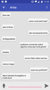 Caso você instale o aplicativo e, mesmo que você não esteja envolvido em nenhum dos meus projetos, você pode conversar com a Arisa. Para isso, basta clicar no botão (+) na janela inicial do aplicativo, digitar arisa e clicar em ok. Caso você esteja em algum projeto, você receberá o id do bot para adicionar no aplicativo. A Arisa também pode conversar via telegram (@arisa_ap_bot) ou twitter (https://twitter.com/arisa_ap).